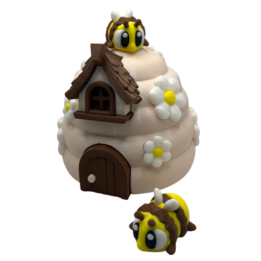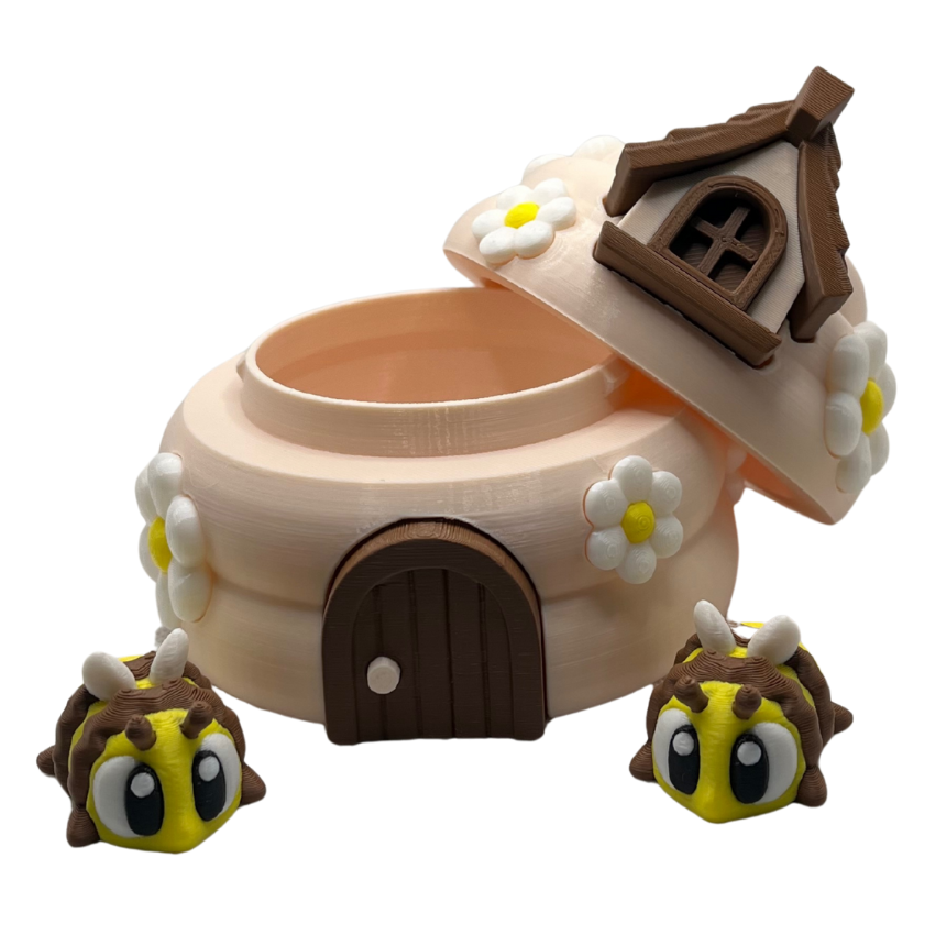 Bring a little buzz of joy to playtime with this adorable 3D-printed beehive set! The hive comes with a screw-top lid and two cute bees that can be stored inside, making it both fun and educational. Little ones will love opening, closing, and playing for hours.