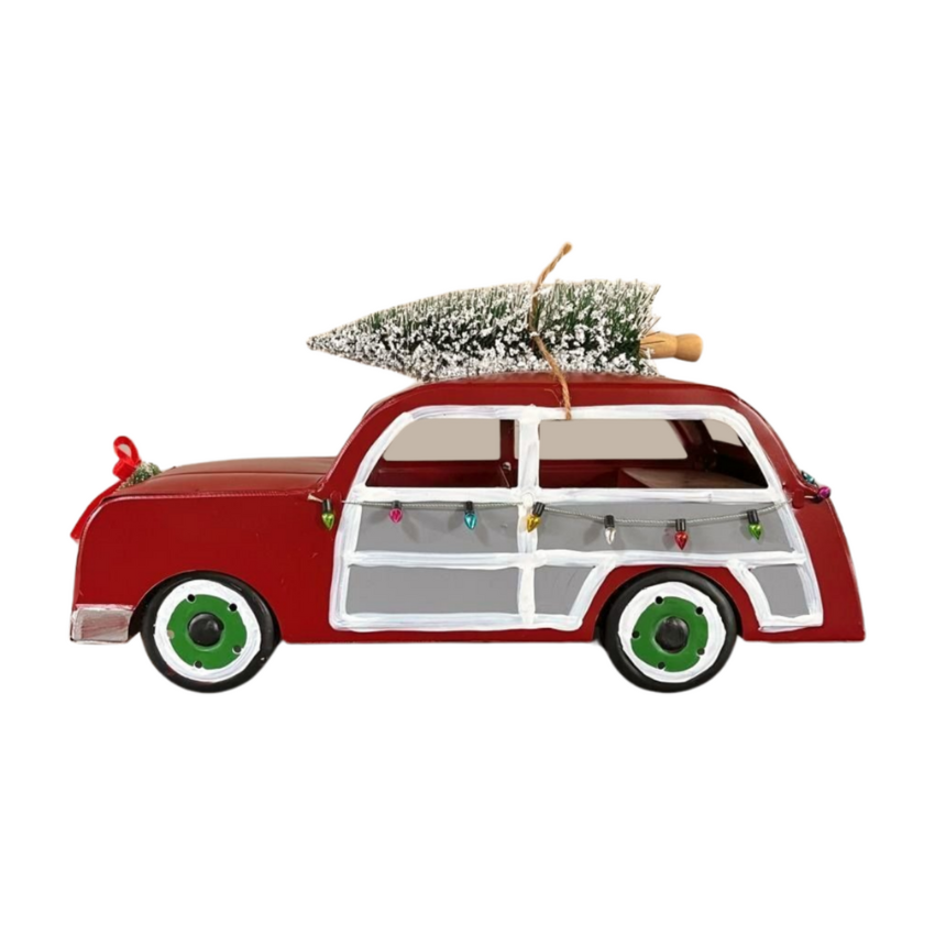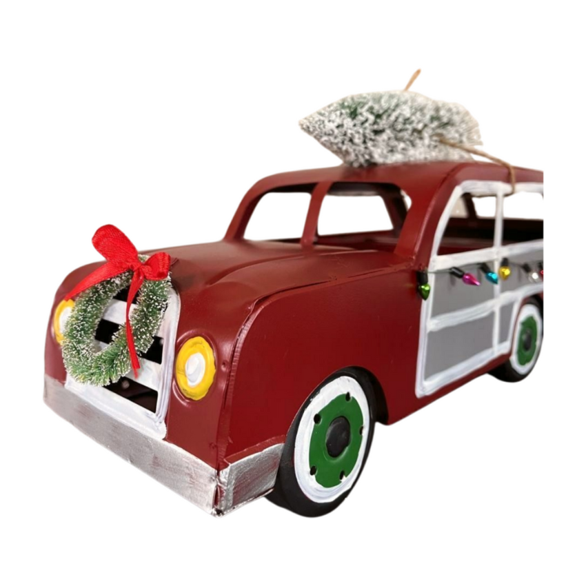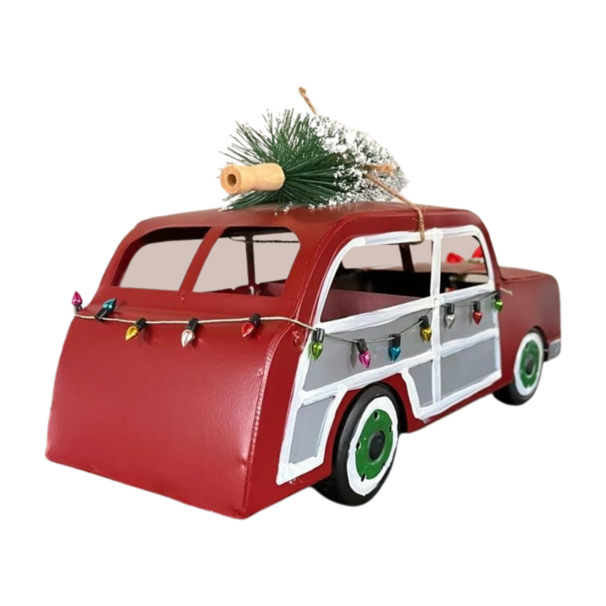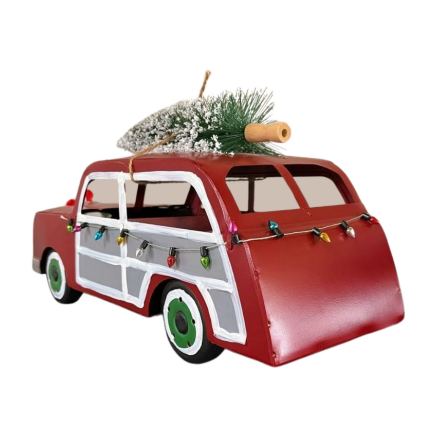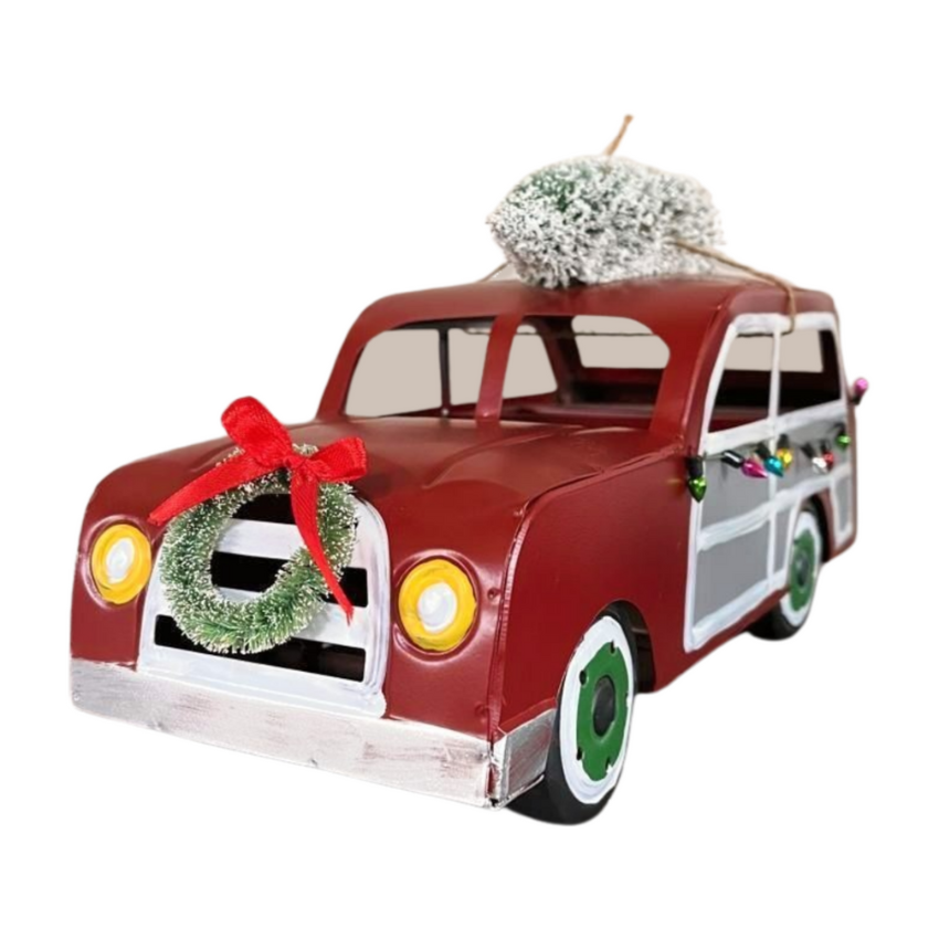 Capture the essence of Christmas with our handmade metal car decoration. Adorned with a miniature Christmas tree and wreath, this charming piece evokes nostalgic holiday charm and makes a perfect centerpiece for festive displays.